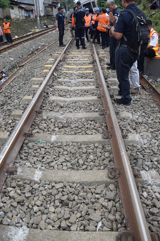 しかし、それより酷いのはKCI本社の白シャツ連中で、ノコノコと現れては、ただ眺めているだけというか何というか。他人事なんですよね、態度が。まあ、そうしなければ自分のクビが飛んでしまうので、私は知りませんと振舞うしかないのですが。エバ嬢のマスコミ対応も、毎度ながら白々しいですな。もっとも、施設はKAIの保有ですから、KCIは知ったこっちゃないと言えばそれまで。しかも、区間によって運輸省予算でやっているところと、KAI予算でやっているところがあり、これまた責任問題の擦り付け合いになります。私腹を肥やしたオッサンどもは自分の腹を切ることなんてしませんから、KAIの架線保線部門の課長あたりのクビを切ったとか、そんなところでしょう。しかし、これでは根本的な問題解決にはならず、本来は施工業者のPT.DENSHAの管理体制まで追及すべきで、さらに言ってしまえばPT.DENSHAと癒着しているKAI、運輸省、さらに言えば日系商社・日系コンサルにまで調査の範囲を広べきなのではないでしょうか。日本式の架線柱を当地で建設しているのは、ほぼPT.DENSHAの独占で、何か裏があるのではと勘繰ってしまいます。架線倒壊は、今回に限った話でなく、これまでに度々発生しており、日本式架線柱の区間で多く発生(Serpong線のSerpong以西やBogor線のDepok~Bogor間)しているというのは、気がかりです。いずれも、川に沿った段丘のへり上の区間が多数あるという、地質的な要因も少なからずあるかとは思いますが。実際に、今回の現場もドロドロで、雨上がりということもあり、足元は悲惨な状況になりました。下り線側には側溝などの排水設備などは、ありませんでした。まぁ、あくまでも個人的な見解です。