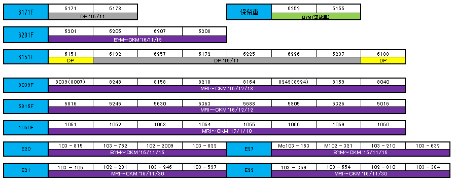 マト51は変化なく・・・。どのタイミングで12連化されるのでしょうか。猫バス、6151Fの2両や、こちらの中間予備車群にも変化はありません。今年度末にも新たな廃車ヤードに配給されるのでしょうか。これらを使って、メトロの10連化は、さすがに無理でしょう。8610Fは本日の予備、05-112Fは車輪限度値割れによる、車輪交換待ちのようです。とはいえ、潤沢な予備車輪がありますので、すでに交換作業に入っていることでしょう。