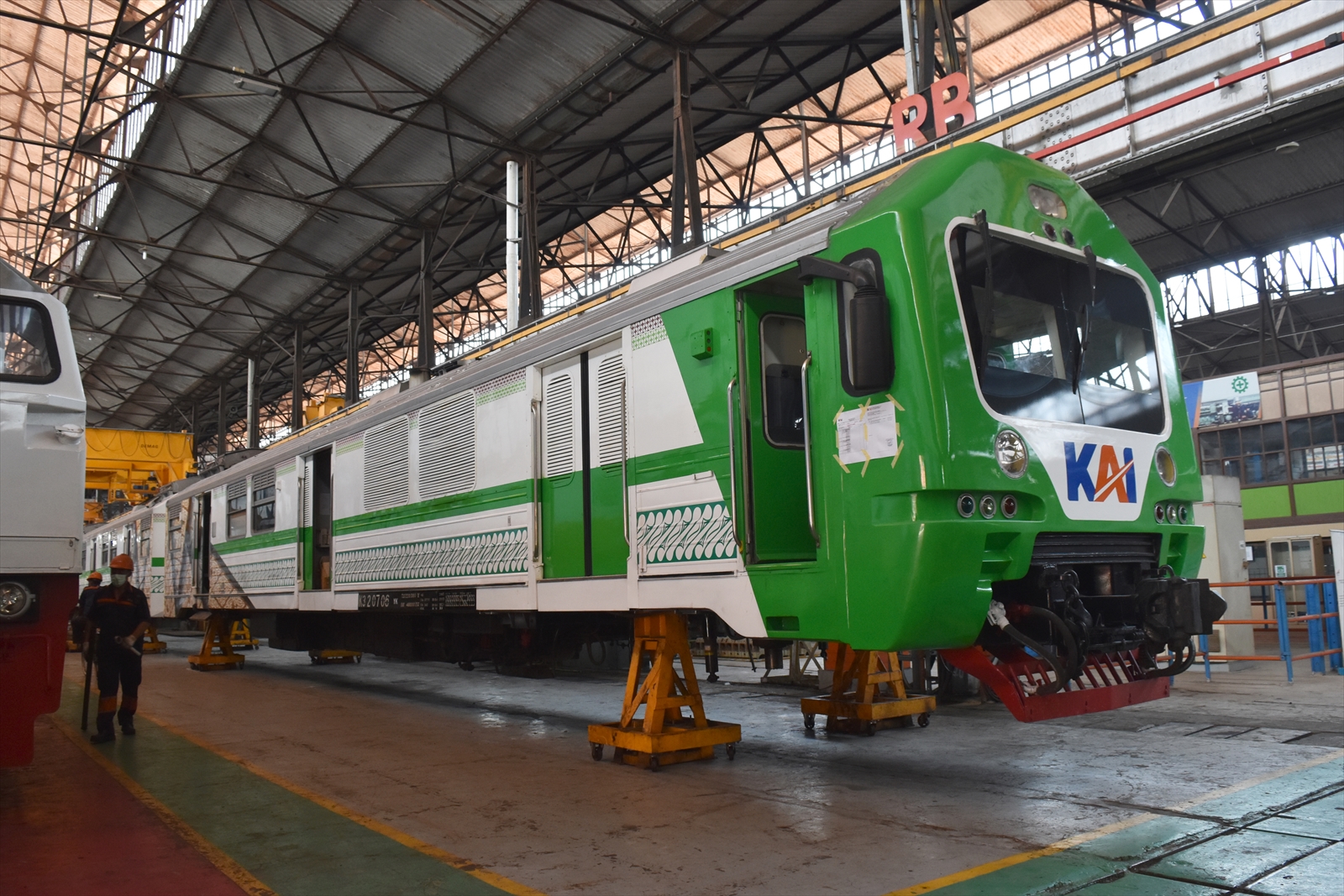 Balaiyasa Yogyakartaでは、現在、機関車の他にも年間30両程度、気動車の重検査も嫌々?受け入れています。検査サイクルと部品供給がルーチン化した機関車に対し、未だに気動車メンテナンス体制は構築されておらず、日車KRDはもちろん、INKA製気動車に関しても部品供給はありませんので、手探り状態でのメンテナンスが続きます。P24、P48の類も、気動車に対してはエンジン稼働時間でメンテナンスを行っており、それが車体側面の検査表記が更新されない理由のようです。それとは別に台車検査及び4年に1回(らしいが、実際には全然行われていない)の車体整備が設けられています。そんなわけで、こちらの緑Holecは今月上旬時点で台車検査中。噂の新幹線リレー号向けの改造タネ車ではないようで何より。まあ、リニューアルしたばかりですし、当面はソロ空港線及びジョグジャ空港線予備車として残る模様です。