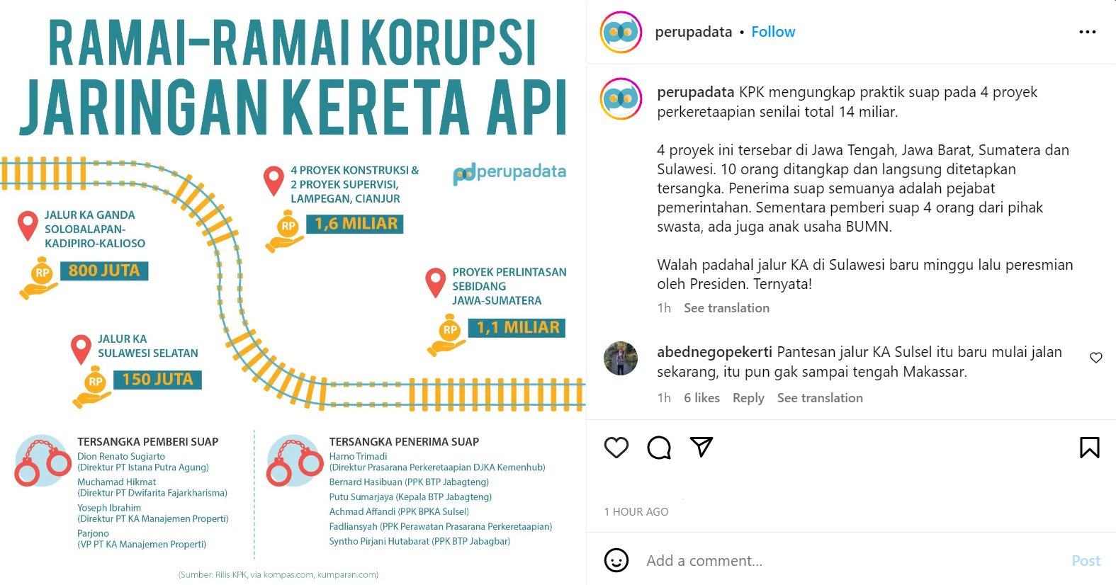 で、ブディカルヤがなんか謝っているなぁと思えば、運輸省鉄道総局に巨大汚職発覚との報。いや、私に言わせれば何を今更なんですが、ジョコウィの鶴の一声で、需要予測すら無しにいきなり始めたプロジェクトは全て汚職でしたという話。ですが、あくまでも鉄道総局内の人間がやったことということで、ジョコウィもブディカルヤも一切責任は取らないらしいです。まあ、とにかくブディカルヤはクソオブクソということですよ。奴のでっかい腹を見れば、相当量の賄賂が入っていることは明らかです。