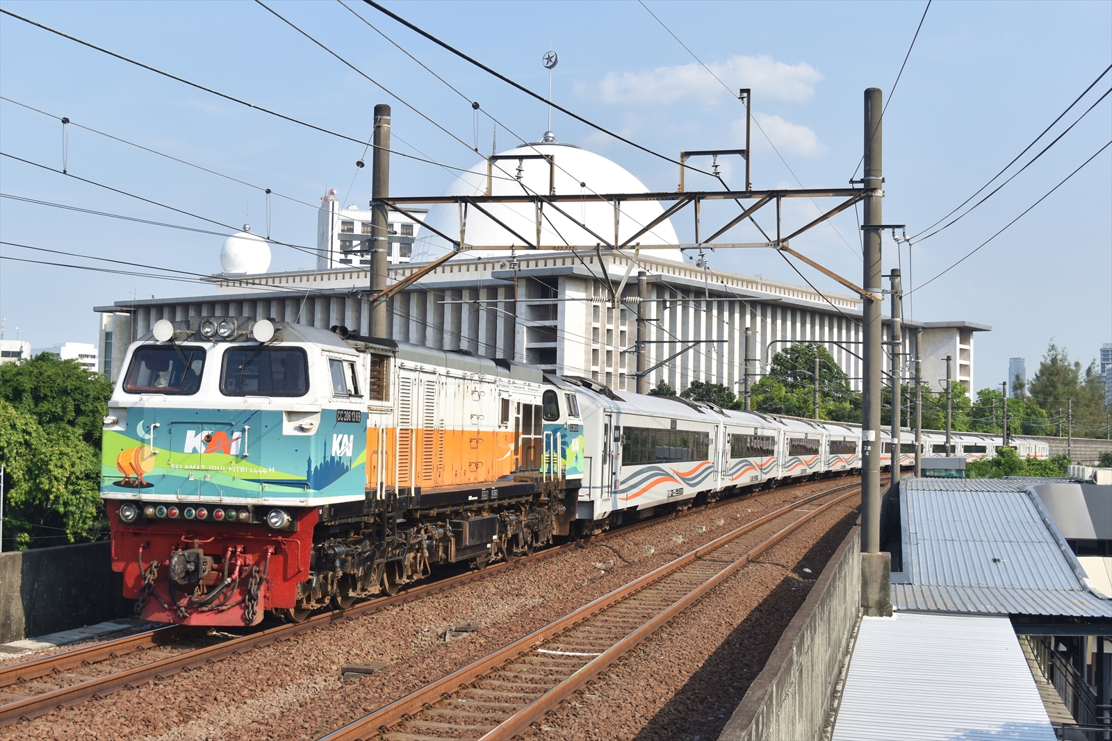 ミャンマー、バングラディッシュ方面に巨大な台風が発生しているようですが、こちらに雲が吸い寄せられている影響で(終日、強い東からの風、どんだけ強い台風なんでしょうか・・・)、ジャカルタはここ数日、滅多に見られない快晴が続いています。そんなわけで、5月にもなりましたので、久々にジュアンダに行ってみました。この半年の間にトランスジャカルタのバス停の改修と連絡通路が完成しているのですが、駅先端での撮影に構造物が支障しないか、心配でしたが、なんとかギリギリ撮れるようで安心しました。ちょっと視界がうるさく、エレベーター棟の屋根が邪魔ではありますが‥。