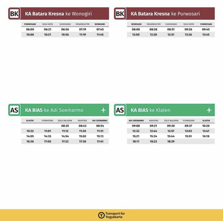 そして、問題のKAIが運行するソロ空港線。KAI普通列車扱いですので、空港線に関わらず、その運行実態を明らかにしないという、KAIの秘密主義の典型例ですが、さすがにそれではマズいよね、と一部の若者(ヲタ)たちが気づいており、公共交通原理主義サークルFDTJのジョグジャ支部が下記の時刻表を作成して公開していますので、貼っておきます。実は、この時刻表、公式が出すよりも早くツイッターに上げてくれていたのですが、公式が5月31日にまさかの修正を入れてきた為に一旦削除された後、Railinkと同様に昨日再アップされました。KAI Accessから裏取りしてみましたが、これで正しいようです。