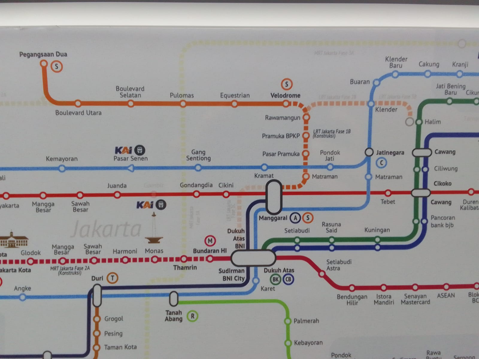全く何を言っているのかわからないという人の為に、路線図を上げておきます。こちらがLRT Jakartaのフェーズ1B区間です(濃い点線部分)。そうそう、クレンデル方面との分岐向きがオフィシャルに