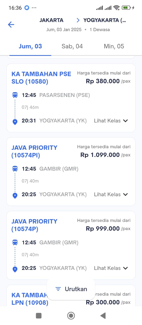 今回、初登場のスネン発の臨時列車です。昨年のレバランでは、特発のManahan救済臨(今回のJava Priorityのスジ)が当初、ジョグジャカルタ~ガンビル間で設定され、編成はそのままに、レバラン後半戦ではソロ~パサールスネン間に運転区間を変更して設定されており、両方が同時に設定されるとうのは初めてです。上りこそ1時間ほど時間がずれていますが、下りはスネン、ガンビルを同発で、Java Priorityの5分後をひたすらTambahan SLO-PSEが追っかけていくという、超マニアライクなスジになっています。