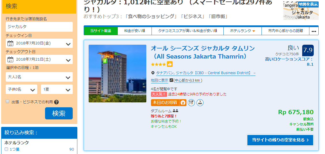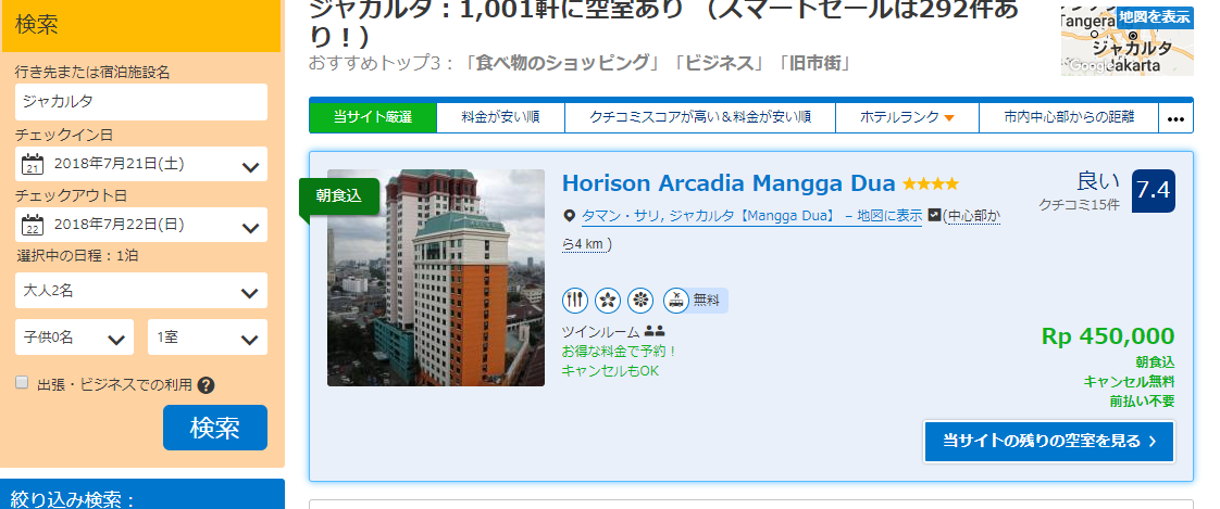 日程はテキトーに1泊2日で設定し、料金を出してみましたが、さすがにSudirmanはちと高くなっているのかな。ただ、見てくれはやや高く見えますが、ルピアがこのところあり得ないほど暴落(1円130ルピアくらい?)しているので、実際は6000円くらい(かもっと安いか)になります。しかも、部屋毎の料金ですから、2人1部屋の場合は1人あたりですると半額となります。朝食フロアが最上階にあるのもポイント高い(内容もそこそこ充実、が電車は一瞬見えるだけ;;)ですので、多少値が張ってもSudirmanの方がお得と言えるでしょう。